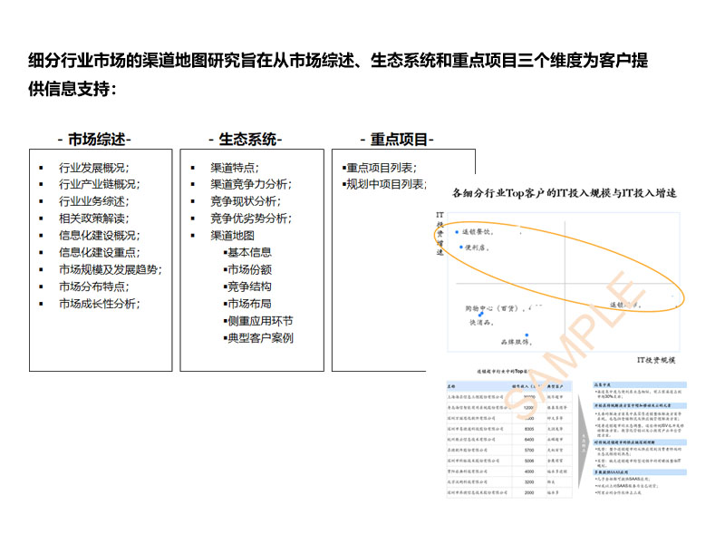 針對(duì)客戶特定的業(yè)務(wù)需求開展專項(xiàng)市場研究,輸出專項(xiàng)研究報(bào)告,并提供報(bào)告匯報(bào)。常見的專項(xiàng)研究項(xiàng)目如生態(tài)系統(tǒng)滿意度研究、生態(tài)系統(tǒng)監(jiān)測研究等。